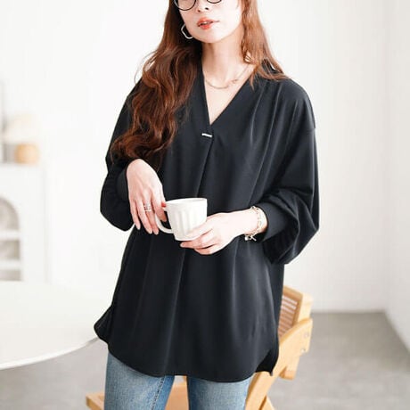 ラフな着心地で美人見え、Vネックパール付き胸タックチュニック。体型を拾わないゆとりのある身幅でストレスフリーな着心地◎ぽっちゃりさんの気になるお腹&ヒップがすっぽり隠れるチュニック丈で体型カバー力も抜群です☆Vネックと胸元タックでシャープな印象を作り出します。胸元タックでバストにゆとりを作ることで大きめバストの方も窮屈感なくご着用いただけます◎さりげないパール装飾でアクセ要らずの華やかさ♪