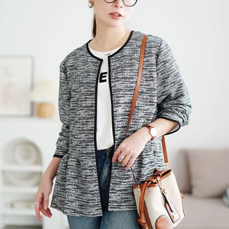 羽織るだけでスタイルアップが狙える!ラメツイードノーカラーペプラムジャケットの登場です☆きちん感のある見た目なのにゆったりシルエットでリラクシーな着心地♪ストレッチツイードなので重ね着をしても窮屈感なくご着用していただけます◎ウエストからふわっと広がるペプラムシルエットが自然にくびれをつくりヒップラインをカバー♪パンツスタイルはもちろん長すぎずちょうどいい着丈感なのでスカートとも相性抜群です!