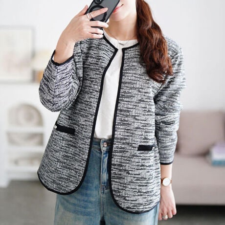 煌めくラメで華やぐ、配色パイピングラメツイードジャケットの登場です☆きちん感のある見た目なのにゆったりシルエットでリラクシーな着心地♪ストレッチツイードなので重ね着をしても窮屈感なくご着用していただけます◎今っぽさと洒落感を兼ね備えたツイード生地で女性らしい柔らかな印象に♪配色パイピング&ダミーポケットでこなれ感のあるメリハリをON☆どんなスタイルにも取り入れやすいノーカラー&レギュラー丈で大満足の着まわし力!