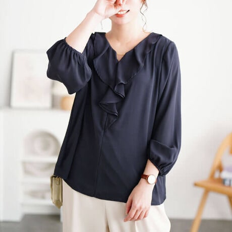 お顔まわりがパッと華やぎ小顔効果抜群!ゴールドパーツ付きラッフルブラウスの登場です。体型を拾わないゆったりとした身幅設計できっちりとした見た目とは反対にストレスフリーな着心地◎目を惹くデザインとゴールドパーツ装飾でネックレスがなくても華やかな印象に♪ボリュームをトップに持たせることで視線を上げスタイルアップ効果抜群☆オケージョンやオフィススタイル〜カジュアルスタイルまで多様なシーンで大活躍!