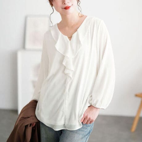お顔まわりがパッと華やぎ小顔効果抜群!ゴールドパーツ付きラッフルブラウスの登場です。体型を拾わないゆったりとした身幅設計できっちりとした見た目とは反対にストレスフリーな着心地◎目を惹くデザインとゴールドパーツ装飾でネックレスがなくても華やかな印象に♪ボリュームをトップに持たせることで視線を上げスタイルアップ効果抜群☆オケージョンやオフィススタイル〜カジュアルスタイルまで多様なシーンで大活躍!