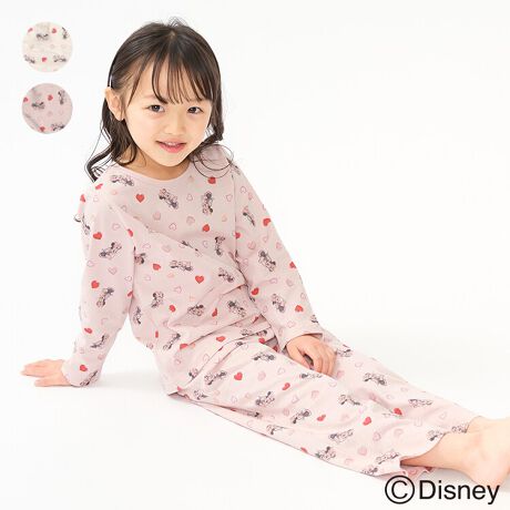 【Disney】人気のディズニーデザインアイテム。ミニーマウスとハートの総柄プリントが可愛い!天竺素材、Tシャツ素材の長袖Tシャツとパンツのパジャマ、ルームウェア。(80、90cmのみお腹が出にくい脇ボタン付き仕様です。)綿100%でギフトやプレゼントにもオススメ!【アイテム】トップス ボトムス カジュアル お洒落 オシャレ かわいい 可愛い ガーリー フェミニン 普段着 デイリーウェア 長袖 ロングスリーブ トップス ロング丈 長丈 長ズボン フル丈 ロングパンツ ボトムス 寝巻 ルームウェア 子ども こども 女児 女の子 ボーイズ キッズ ベビーサイズ トドラーサイズ 幼稚園 保育園 小学校 小学生 2026年春夏物新作 丸高衣料 贈り物 ギフト プレゼント 帰省 お泊り会 旅行 キャラクター オフホワイト 白色 ピンク コットン100% 綿100%