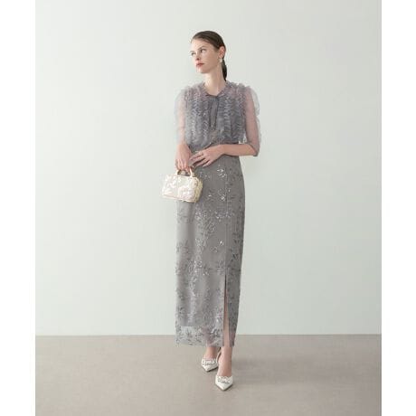フロントのスリットがロング丈に軽やかな抜け感を出し、繊細な総レースのデザインが周囲と一線を画すラグジュアリーな佇まいを演出。