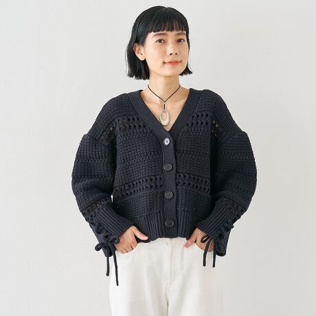 ボックスシルエットのVネックに、袖口のレースアップデザインがさりげないアクセントのニットカーディガン。