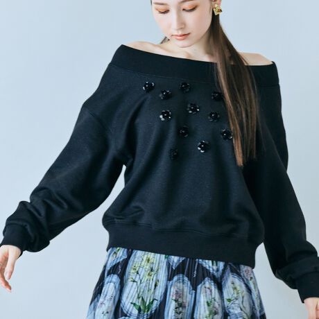 ・着回しやすいスウェットトップスを女性らしくしたオフショルダーデザインのプルオーバー。