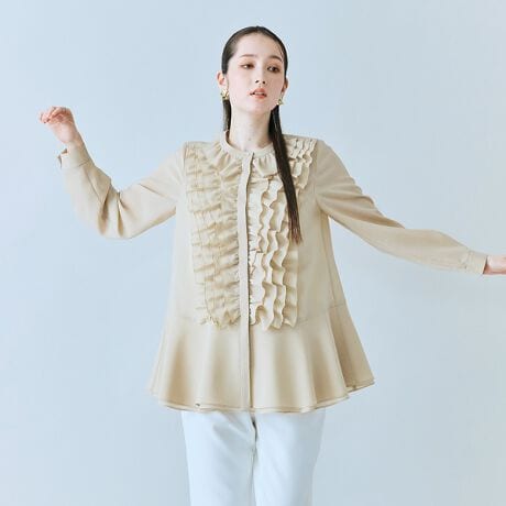 ・肩から身頃にたっぷりとフリルを施した、華やかなシャツブラウス。