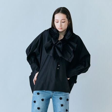 ・昨年人気のオーバーシルエットブラウスをアップデート。ギャザーモチーフのネックレスがアクセントに。