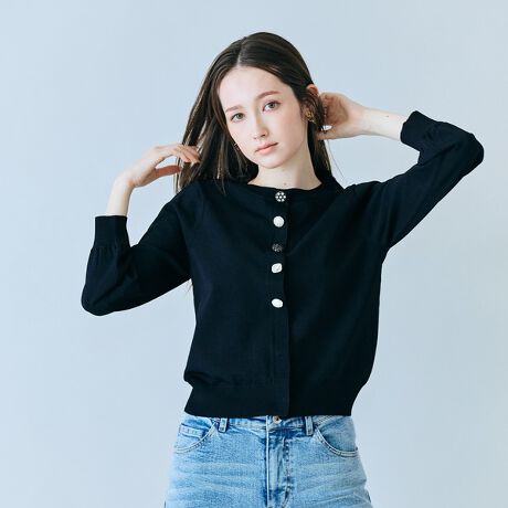 ・キラキラのビジュー釦で気分が上がるラウンドネックカーディガン。