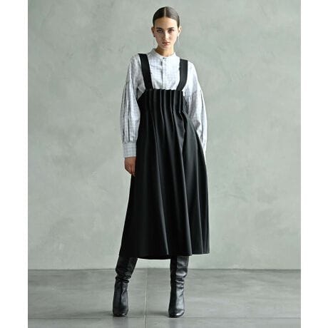 前ウエストの立体的なタックがモードな雰囲気のサスペンダー付きスカート。
