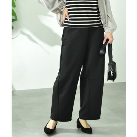 肌さわり良いポンチ生地を使いシルエットにこだわったカーブパンツ。ヒップ周りは程よくゆとりがあり、太ももから裾にかけてカーブになったシルエットが魅力のパンツです。裾と膝にダーツを施すことで立体的なシルエットが生まれ大人の抜け感が演出できます。洗練されたパンツスタイルが完成するお勧めな1枚です。