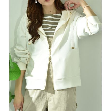 本体は肌さわりの良く上質なダンボールニット素材を使用。優しく包まれるような着心地がポイントです。一見カジュアルなアイテムですが、コンパクトなすっきりしたシルエットが魅力です。袖に切替を入れランタンスリーブでモードな印象にも。他のシンプルパーカーとさりげない差がつくお勧めな1枚です。また両開きのゴールドファスナーを使用し、高級感ある大人カジュアルコーデにきまります。
