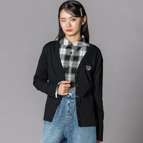 ドロスト脇がかわいく動くチェックシャツに、Vネックカーデの左袖刺しゅうがさりげなく主張してくれて、大人っぽいけど盛れ感はちゃんとキープ。
