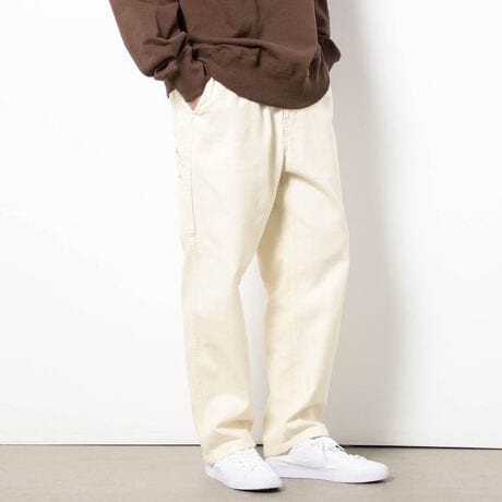 ペインターパンツならではのディテールを残しつつ、ウエストはゴム入りのイージーパンツ仕様にアレンジ。