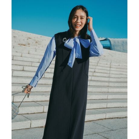 すっきりとしたIラインシルエットに、深めのキーネックが程よい抜け感を演出してくれるジャンスカ。やや高めの位置にのポケットは、自然にスタイルアップを叶えてくれます。バックスリット入りで足さばきもよく、着用感もラクに仕上がっています。