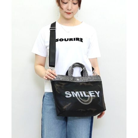 SMILEYの文字が入ったメッシュ素材のトート+ショルダーバッグにもなるインバッグ付きのマルチWAYバッグ