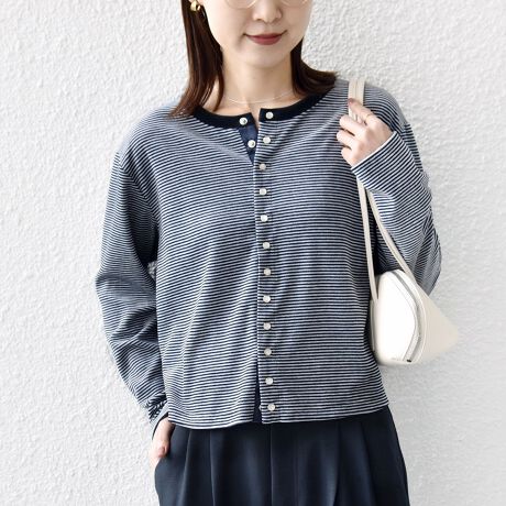 ボーダーとパールボタンでデザインが効いているので、シンプルなスタイリングでも一枚で様になります。