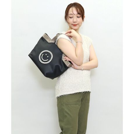 パール調のビーズでSMILEYフェイスを施したデザインがポイントのトートバッグ
