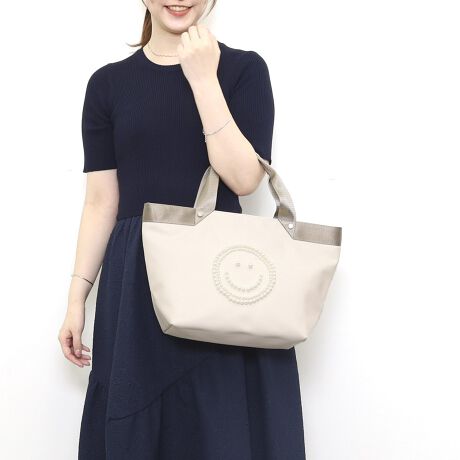 パール調のビーズでSMILEYフェイスを施したデザインがポイントのトートバッグ