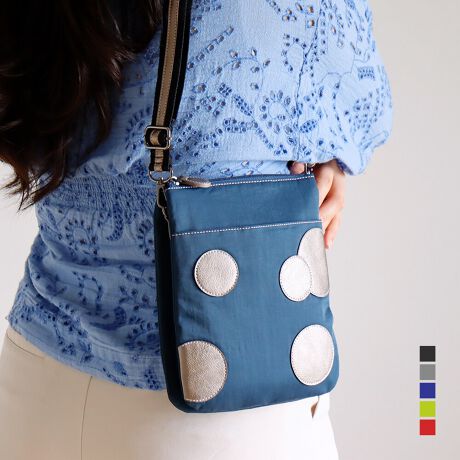 水玉のようなモチーフ、ナイロン本体の表面にメタリックなサークル状の合皮を引っ張り付けたお洒落なポシェットです!
