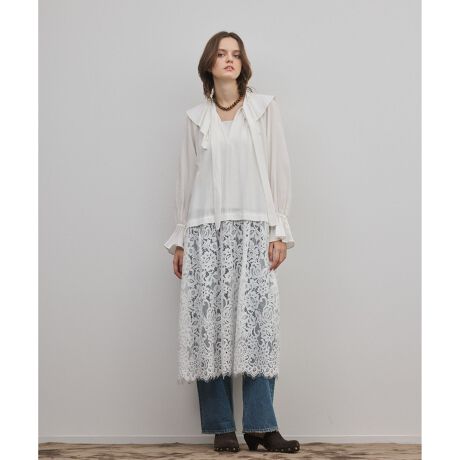 愛らしいフリルカラーが女性らしい、春ムード高まるカフタンドレス。身頃にはほどよい落ち感のコットンレーヨンナイロンのスラブ素材を、スカートには大柄のフラワーレースを使用した華やかなドッキング仕様で、軽やかな一枚に仕上げました。スカート部分はスカラップで処理した美しい仕様にし、さらに透け感や柄感を楽しめるようあえて裏地なしでお作りして、デニムなどのパンツに重ねて旬なレイヤードスタイルを楽しめるデザインに。首もとはすっきりとしたVネックにする事で、甘くなりすぎない大人な佇まいにしたのもポイントです。エフォートレスな魅力が詰まったシーズナブルなドレスを、この機会にぜひ。
