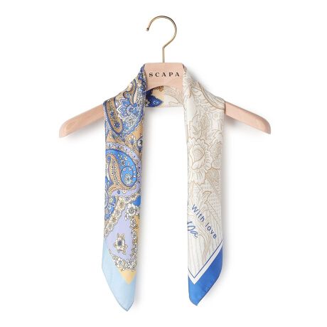 ふたつのペイズリー柄を斜めに切り替えた遊び心漂うシルクスカーフ。首に巻いたときにも単調にならず、さりげないスパイスの効いたスタイリングを叶えてくれます。