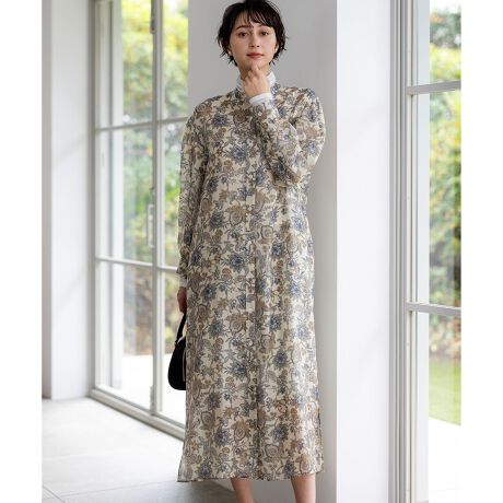 上品なペーズリープリントが目を引くシャツワンピース。美しいプリントを活かしてデザインはシンプルに仕上げています。ワンピースとしてはもちろん、前ボタンを開けて軽やかな羽織りとしてもお楽しみいただけます。オフィスシーンでは、ジャケットやカーディガンを羽織ってきちんと感を。休日のランチや旅行には、一枚でさらりと着こなしたり、デニムなどのボトムとレイヤードしてカジュアルダウンしたりと、幅広いシーンで活躍します。カラーは、柔らかな印象で上品さを引き立てるアイボリー系(502)と、爽やかで洗練された雰囲気を醸し出すサックス系(572)の2色展開です。