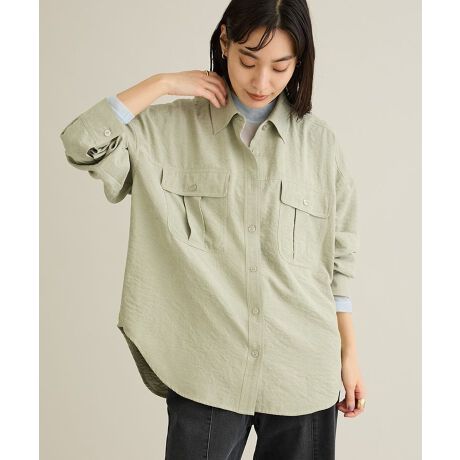 ワークテイストの胸ポケットを配したシャツデザインをベースに、オーバーサイズの身幅と後ろ下がりのラウンドヘムで今っぽい抜け感を実現。