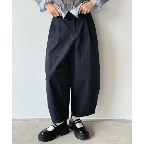 ☆ぽわんとカーブのシルエットが魅力☆裾に向かって緩やかにカーブしたラインが目を惹く9分丈パンツ。後ろウエストはゴムが通っているので、動きやすく締め付け感も軽減されるので着心地が良いです◎脚のラインを拾わないサイズ感はエイジレスに着こなせる点が嬉しい!フルレングスよりやや短い丈感で、シューズやソックスのディテールを活かしたコーデが楽しめます♪
