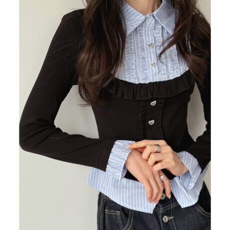 ☆Y2Kの雰囲気たっぷり!ドッキングトップス☆ストライプシャツとカットソーをレイヤードしたようなドッキングデザイントップス。胸元のドッキング部分とカットソーの前中心にはフリルがあしらわれていてキュートな印象に!やや短めな着丈と、ボディラインに沿うサイズ感でスタイルアップも◎※前中心、カットソー部分はフェイクのボタン開きです。※第1ボタンはシンプルな4つ穴ボタン。 残りのボタンはハートの中にリボンが入ったデザインボタンとなります。