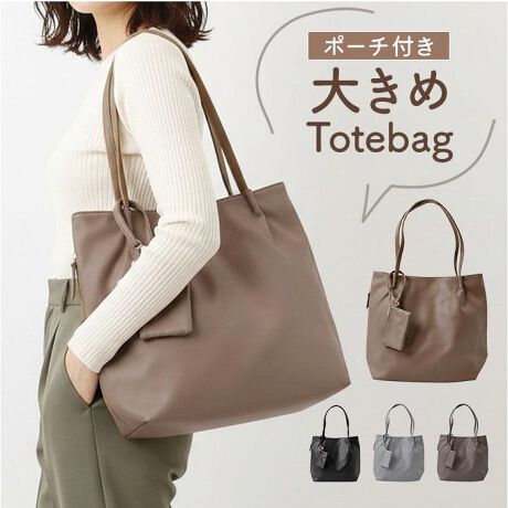 【ポーチ付きトートバッグ】小物管理も収納力も叶う、大きめトートバッグ【便利なポーチつき】持ち手に吊り下げた取り外し可能なポーチで、カギやカードの管理がスマートになる快適さ◎【サイドジッパーの実力】バッグ側面のジッパーポケットにスマホや二つ折り財布を入れて、出し入れスムーズ♪【マグネット開閉】開口部はマグネットボタン式だから、ワンタッチで開け閉めできて便利♪【A4対応の大容量設計】A4ファイルが縦に入る大きめサイズだから、仕事の書類もしっかり収納できる安心感。【内ポケットで整理整頓】ジッパー付きポケットで貴重品を安全に管理でき、オープンポケットで小物も迷子知らず◎【肩掛けできる持ち手】長めハンドルで肩に掛けられるから、両手が空いて移動も楽々で快適〇【整理上手な内部構造】メインルームにジッパーポケット1つとオープンポケット2つで、荷物の仕分けが簡単!【フェイクレザーの上質感】高級感あるフェイクレザー素材だから、きちんと見えて通勤スタイルも格上げできる存在。
