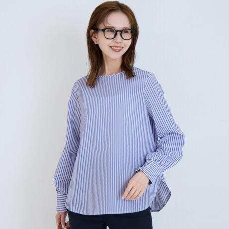 首元をすっきり見せるノーカラーデザインで、上品な印象に