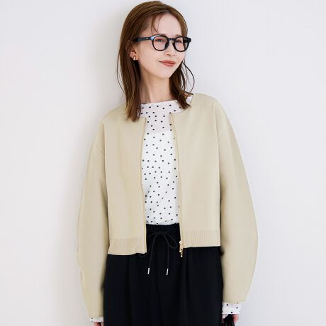すっきりとしたノーカラーデザインで、きれいめスタイルにも取り入れやすいニットブルゾン。