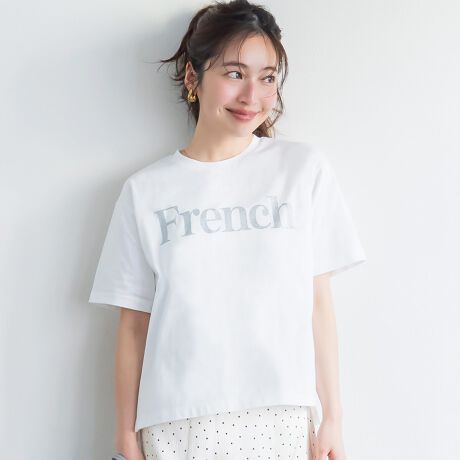 ジャケットやカーディガンのインナーとしても、ラメロゴがコーディネートのアクセントに。