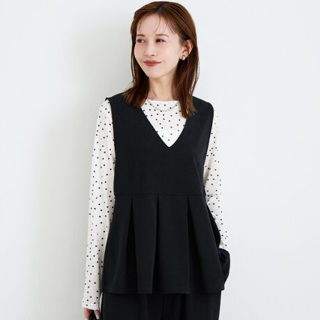 タック入りのペプラムデザインで、ウエストまわりを自然にカバーしつつ女性らしいシルエットに。