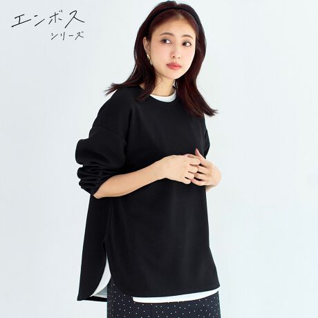 ワイドシルエットで体型カバー。レイヤードも映えるエンボストレーナー
