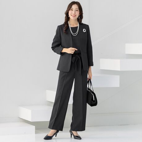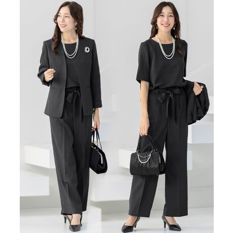 きめの細かいドビー生地の、ジャケット・ブラウス・パンツ3点セットのスリーピースセットスーツです。]