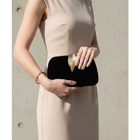 洗練されたデザインが魅力の、リーフモチーフ金具付きクラッチバッグ。