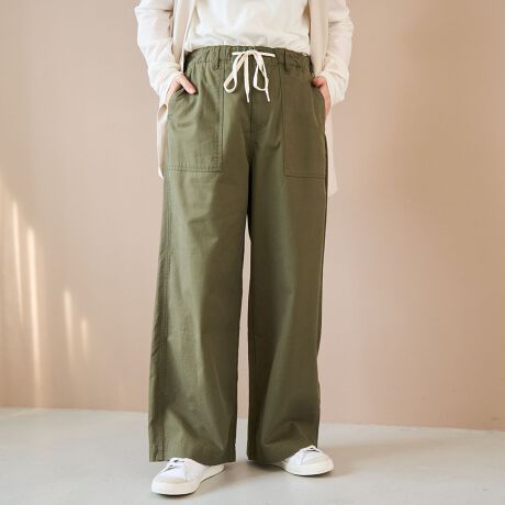 ウエストスピンドル(調整できるひも)付きで、ラクな穿き心地とトレンド感を両立します。