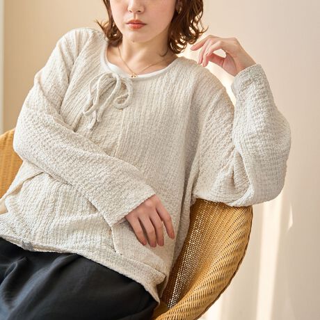 素材感:ポコポコとした表情のある素材が可愛いポイント。ほどよい透け感があり、夏場でも取り入れやすそうな印象です。
