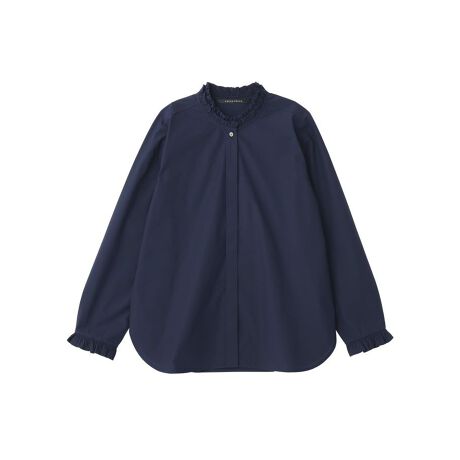 フリルカラーが印象的でありながら甘くなりすぎずモードな雰囲気のシャツ。