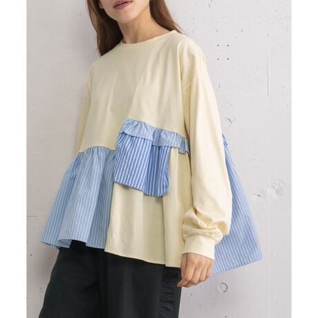 カットソー素材をベースに、布帛生地をアソートで組み合わせたデザイントップス。イレギュラーな切り替えに、たっぷりとギャザーを施したヘムが動きのある印象を与えます。伸縮性のある素材で着心地が良く、ブラウスのような雰囲気で着られるのもポイント。1枚でサマになるのはもちろん、レイヤードして裾をちらっと見せる着こなしもおすすめです。ヒップにかかる着丈で、安心感のある一着に仕上げました。