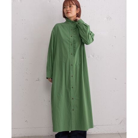衿から前開きにかけてフリルをあしらった、華やかな印象のシャツワンピース。1枚でさらっと着るのはもちろん、ベストやニット、スウェットを重ねたレイヤードスタイルもおすすめです。両サイドにポケット付き。
