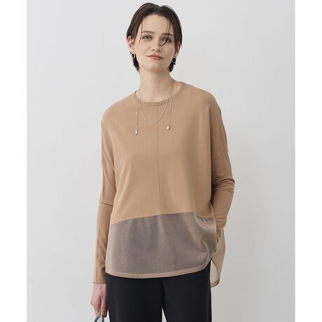 ■デザインICBのベストセラーニットに、シアー素材とのコンビネーションデザインが登場。シアー部分は適度にハリコシのある素材なので、流れるようなシルエットがモードで洗練された印象です。オーバーシルエットのボディーと細身の袖とのメリハリのあるシルエットで、『Tシャツ以上セーター未満』の着心地の良いプルオーバーに仕立てました。薄手ながら、適度にハリコシ感も併せ持っているので、体のラインを拾いにくく軽やかに快適に着ていただけます。シンプルながらフォルムやシルエットにこだわっているので、一枚でもサマ見えすること間違いなし。落ち感もあり、ジャケットのインナーとしてもお使いいただけます。