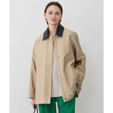 ■素材本体:特殊な毛焼き加工で表面をクリアに仕上げ、コットン100%とは思えない上品な光沢感が特徴のモールスキン素材です。モールスキン特有のごわつきを抑え、ソフトで膨らみ感があるのも特徴です。異素材襟:リサイクルポリエステルを使用したダブルサテンです。特異なポリエステル糸を使用する事で、シルクのような上品な光沢、程よい表情感が特徴です。