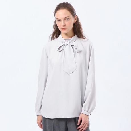 幅が広めのボウタイが華やかな印象のスタンドカラーブラウス。ボウタイは取り外しが可能なので、シンプルなブラウスとしても着用できる着回しのきくアイテムです。一枚着ではもちろん、ジャケットやジレなどのインナーとして、ボウタイを覗かせたレイヤードスタイリングもおすすめです。