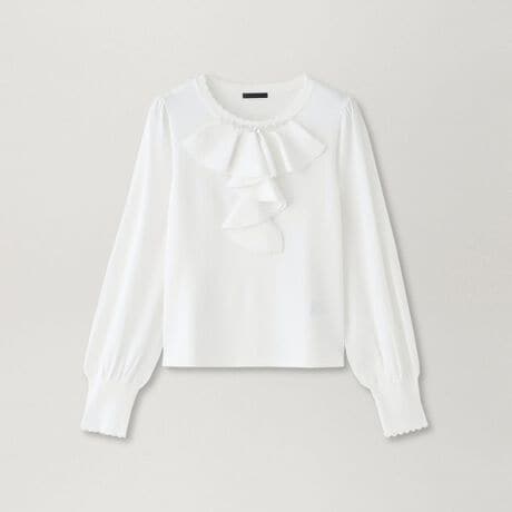 衿元にラッフルフレアの引き返し編みを施し、パールとガラスビジューの刺繍をあしらった華やかなニットプルオーバーです。