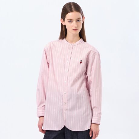バッキンガムベアの刺しゅうが入った定番のバンドカラーシャツ。首元がすっきり見える低めの襟が特徴です。羽織りとしても使いやすい、リラックス感のあるシルエットです。