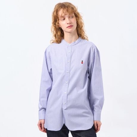 バッキンガムベアの刺しゅうが入った定番のバンドカラーシャツ。首元がすっきり見える低めの襟が特徴です。羽織りとしても使いやすい、リラックス感のあるシルエットです。