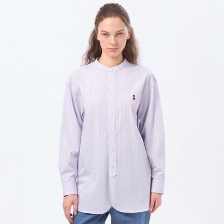 バッキンガムベアの刺しゅうが入った定番のバンドカラーシャツ。首元がすっきり見える低めの襟が特徴です。羽織りとしても使いやすい、リラックス感のあるシルエットです。