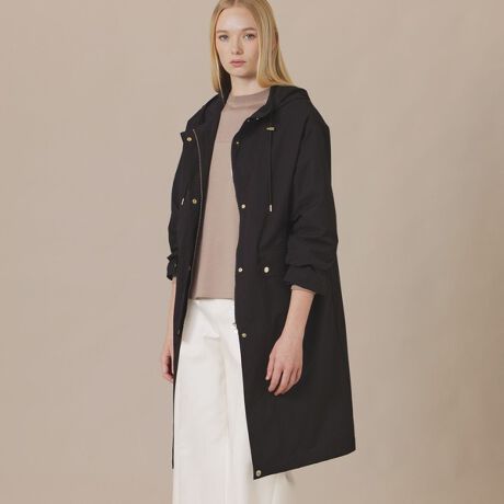 身頃の内側にドット釦が格納されており、裾を折り曲げ止めることでショート丈のブルゾンにもなるコートです。気温の変化やスタイリングでレングスのアレンジが可能です。軽量な素材で着心地の良いアイテムです。
